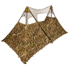 Crafted from durable 75 Denier Nylon double sided camo, this system features a mesh top with convenient shooting windows. Blinds and panel roll up for easy lightweight storage. The reinforced top corner pockets and bottom bracket ensure a secure setup, while the stubble straps and stake loops allow for added camouflage brush to make the perfect set up.